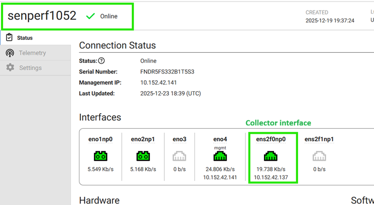 Confirm that the sensor is Online and the collector interface is up with an IP address. See Collector interface.