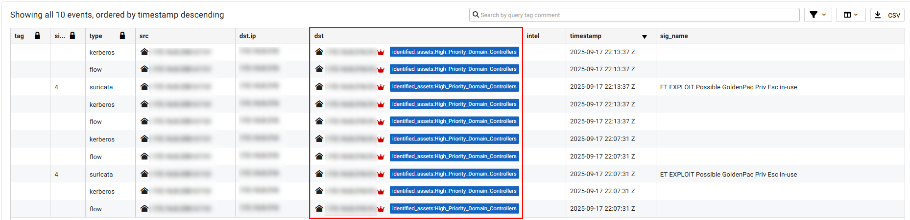 A color-coded crown icon will appear only on assets annotated by FortiGuard ATR in the events and detections tables. See Detections table.