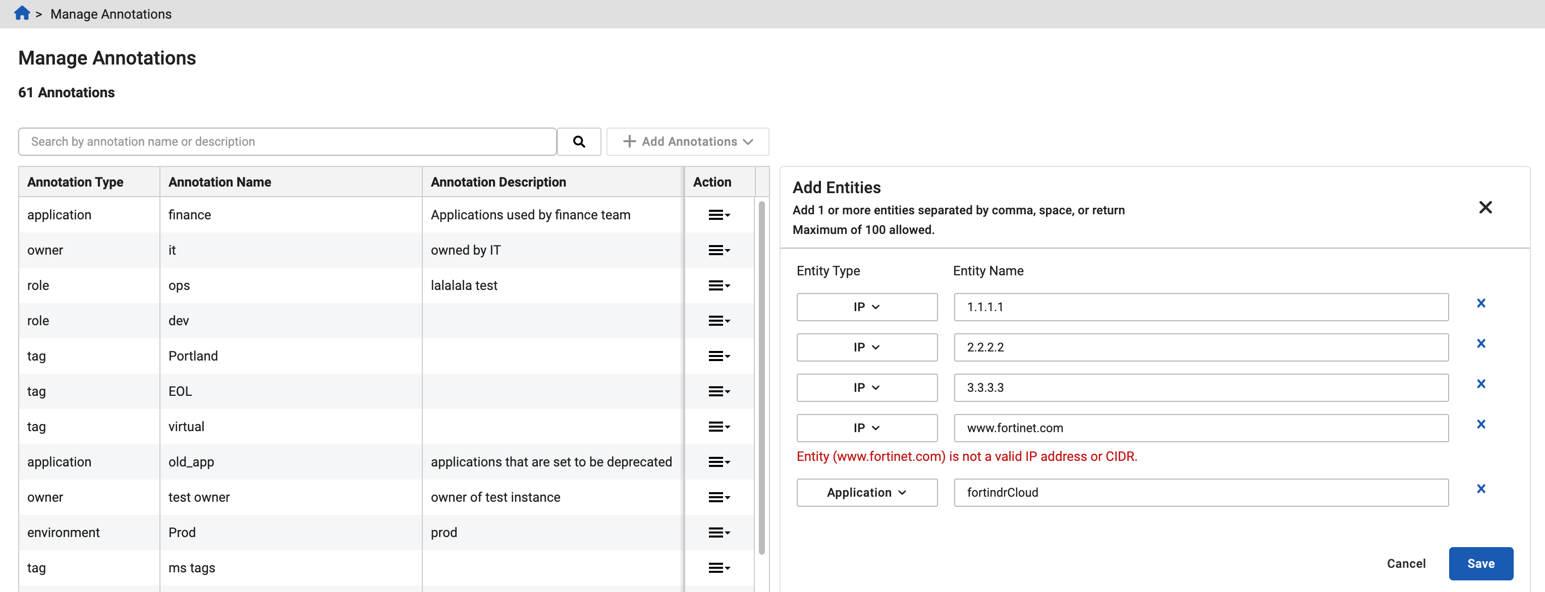 You can create the following annotation types: Application, Environment, Location, Owner, Role, Tag and Identified Assets (system-generated). Identified Assets annotations are automatically created by FortiGuard ATR and cannot be manually added.