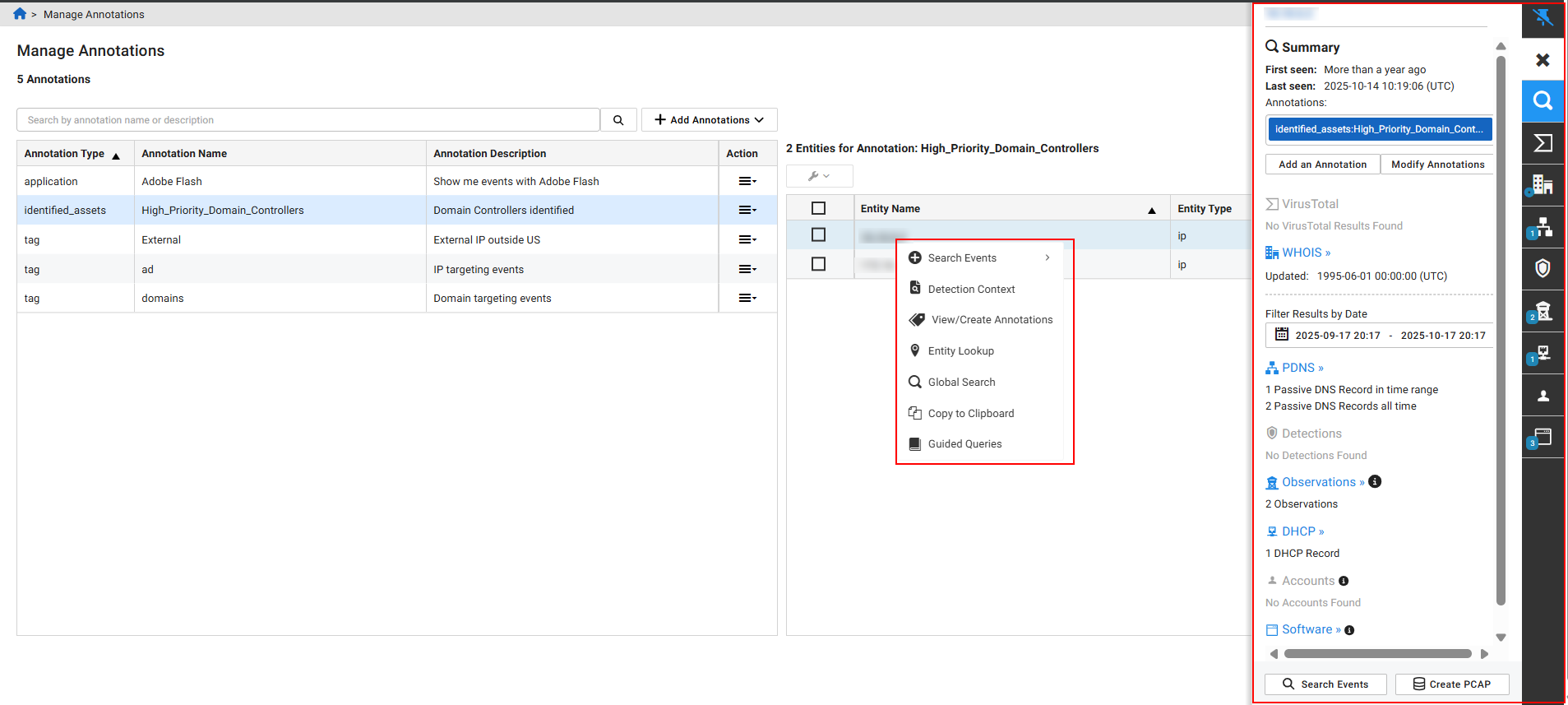 On the Manage Annotations page, you can open the Entity Panel by clicking the Entity Name when it is a valid IP, CIDR, domain, or URL. Right-click an entity with a valid IP to:
