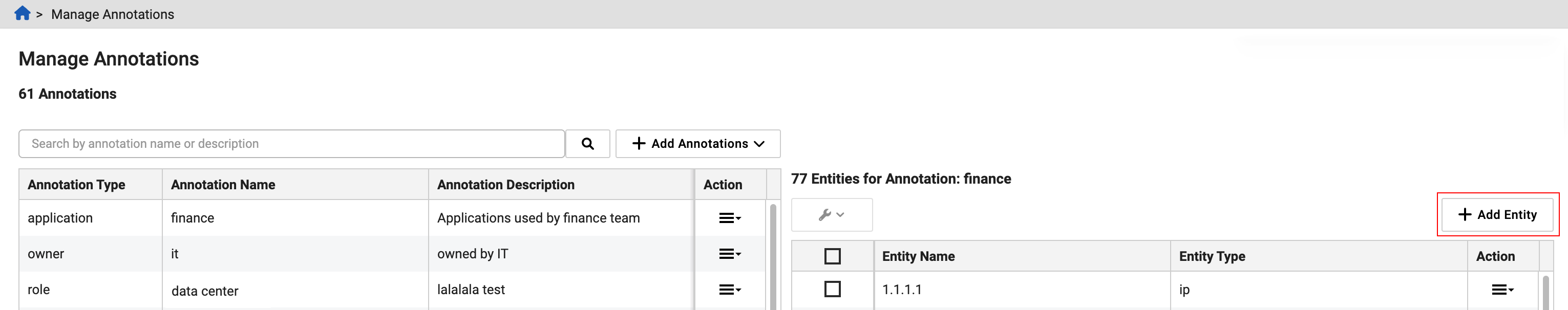 The annotations table lists all existing annotations with their type, name, description, and actions, and provides an option to add new annotations. The entities table shows all entities linked to a selected annotation, including their names, types, and management actions. The search function allows you to search for any text in the Annotation Name and Annotation Description columns.