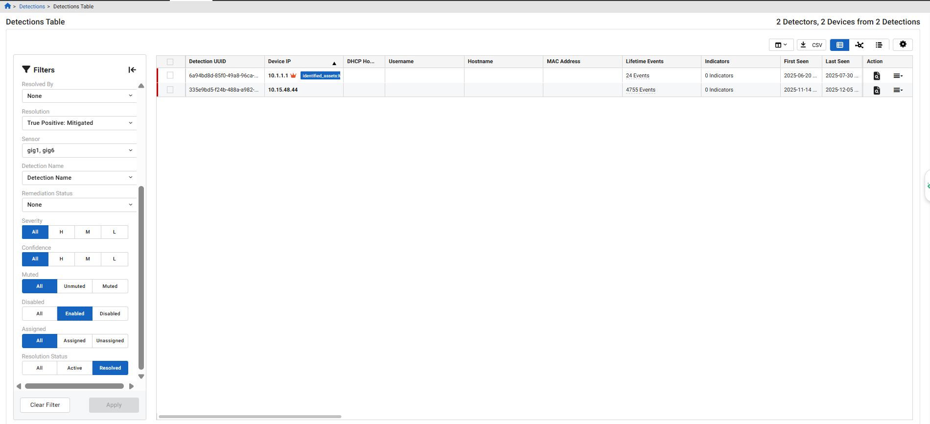 The Detections Table is where you can view all detections. Whereas the Triage Detections and Detections Triage views show detections by detector or device, the Detections Table shows detections by detector and device over time. By default, the table displays detections for the last two weeks. A color-coded bar at the left side of the table indicates active and resolved detections. A green bar indicates an active detection. A red bar indicates a resolved detection.