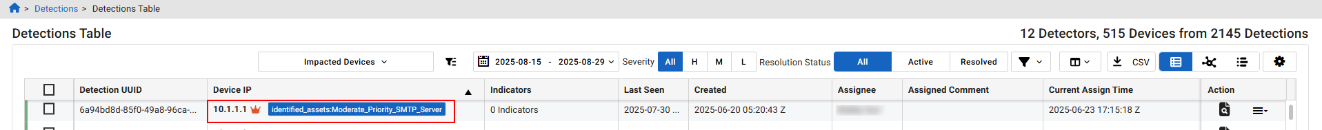 By default, the Detections Table displays detections by all severities and detection statuses for the previous two weeks ending on the current date. You can use any column header to sort the detections. The Filters pane on left side of the page allows you to view detections for a specific IP, refine the list by Severity and Detection Status. You can also toggle between table and graph view.
