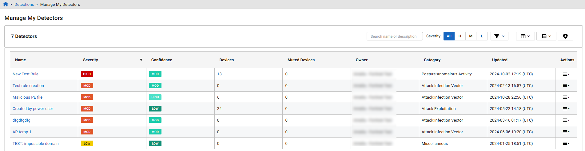 The Manage My Detectors page allows you to view, edit and create detectors. You can also mute, disable and delete detectors.