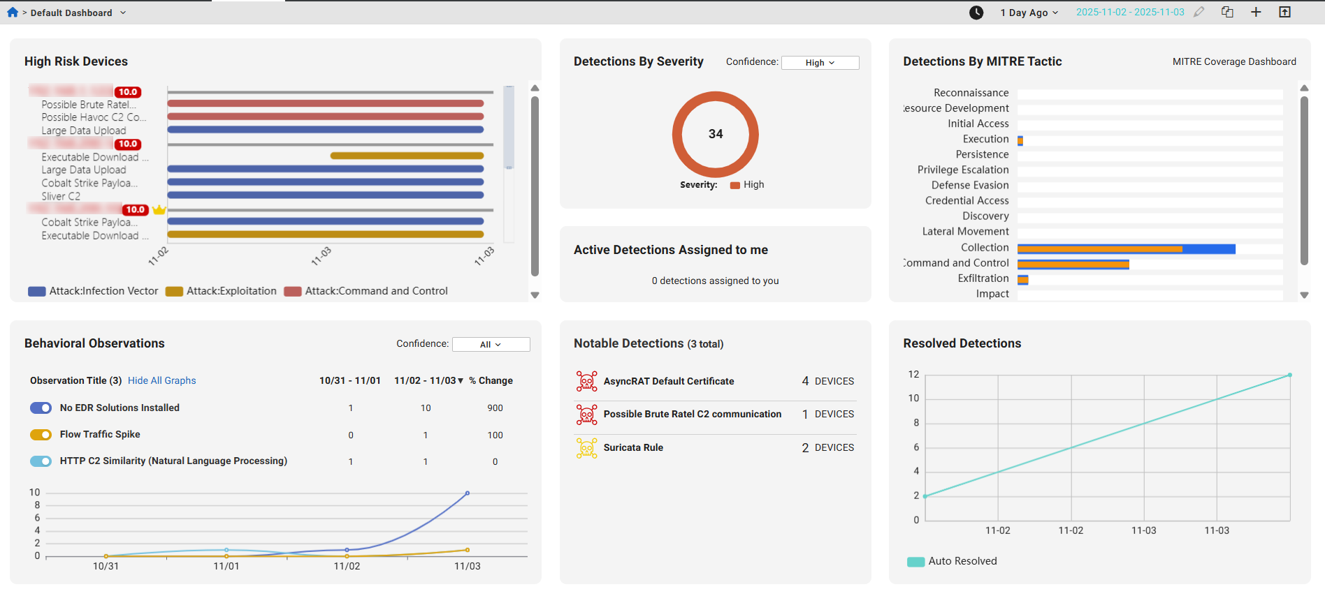 The Default Dashboard organizes detection activity into interactive widgets that display high-risk devices, detection trends, severe threats, and resolved issues over time, helping analysts quickly review threats and prioritize their next steps.