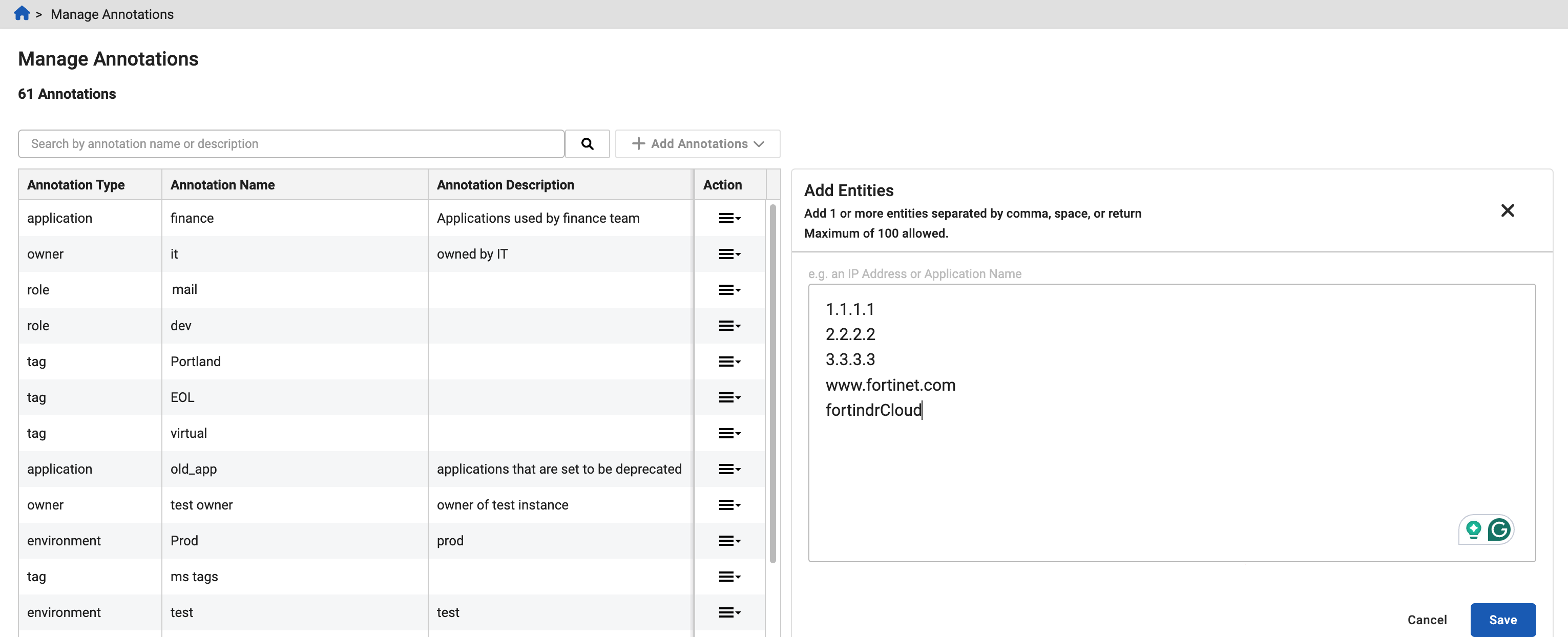 You can create the following annotation types: Application, Environment, Location, Owner, Role, Tag and Identified Assets (system-generated). Identified Assets annotations are automatically created by FortiGuard ATR and cannot be manually added.