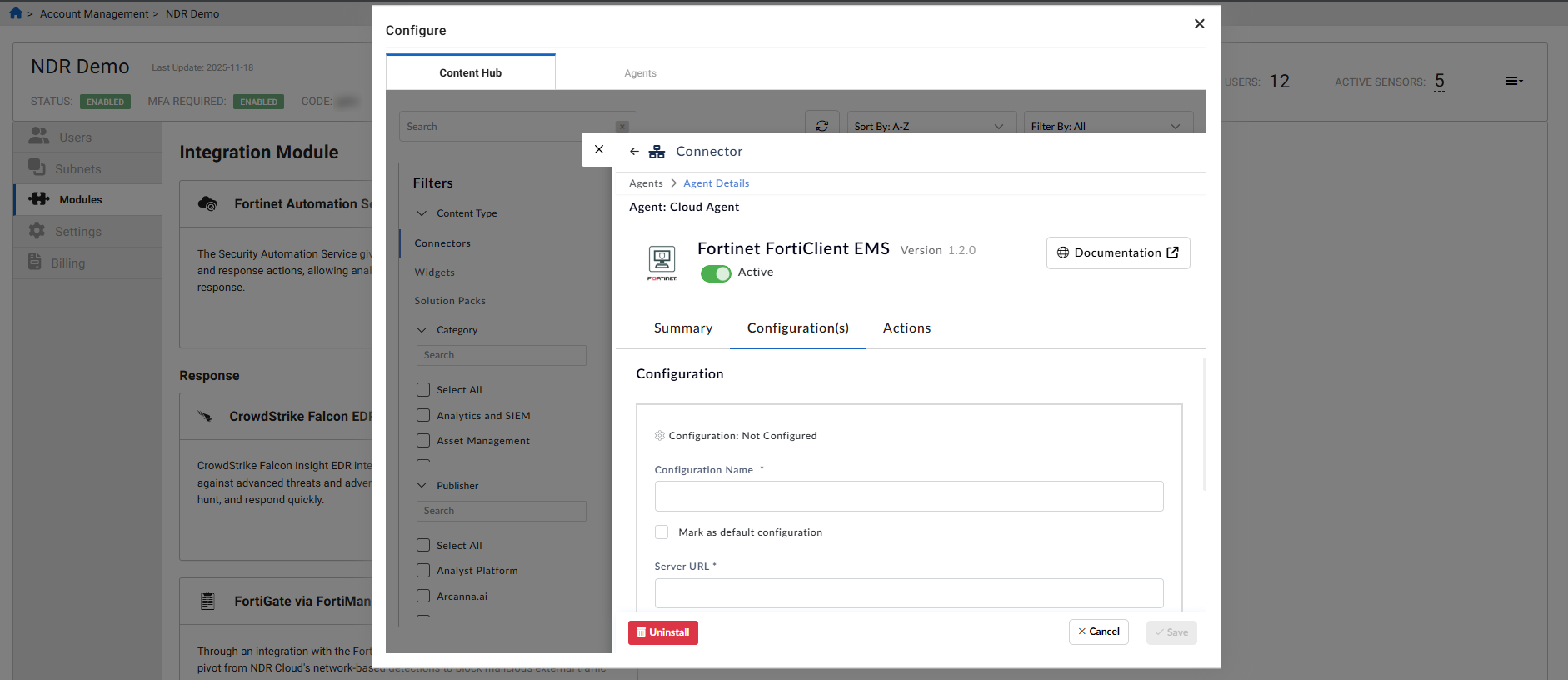 The Fortinet Automation Service agent is a lightweight software component deployed within your environment. Its primary role is to facilitate secure communication between FortiNDR Cloud and the target systems or infrastructure. Agents execute playbook actions locally, such as running scripts, collecting data, or interacting with third-party tools, based on instructions received from the automation service. This allows for real-time automation while maintaining control and visibility within your network.