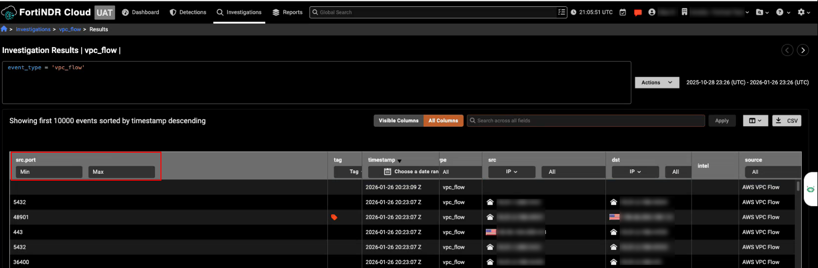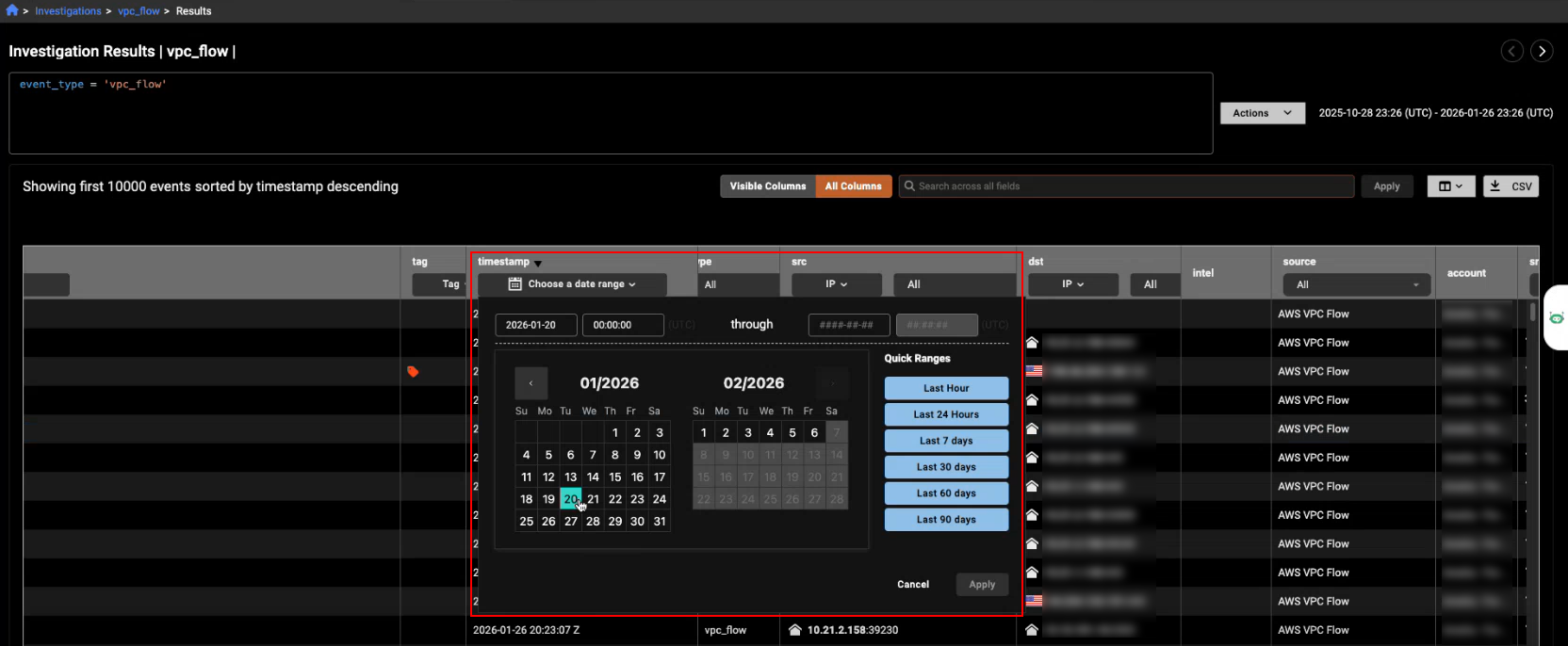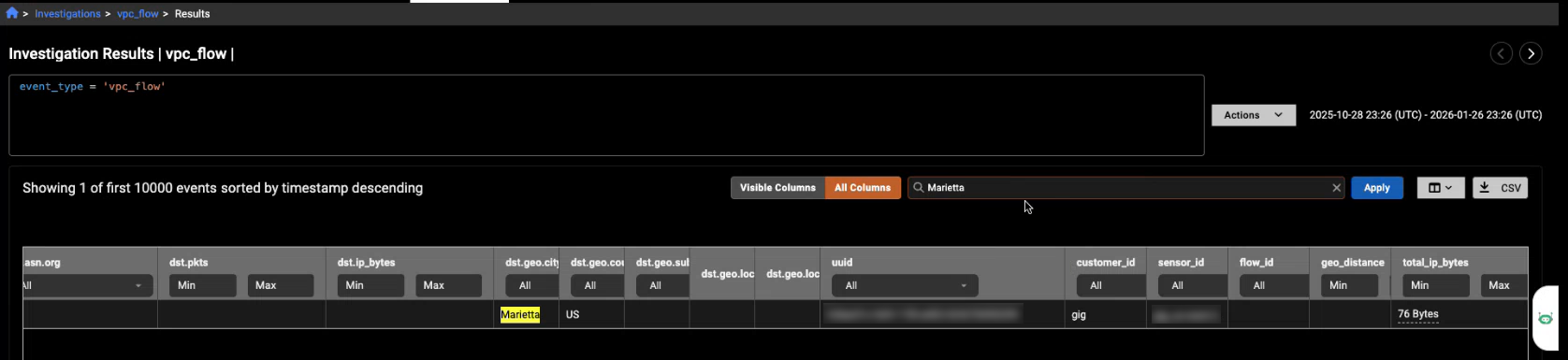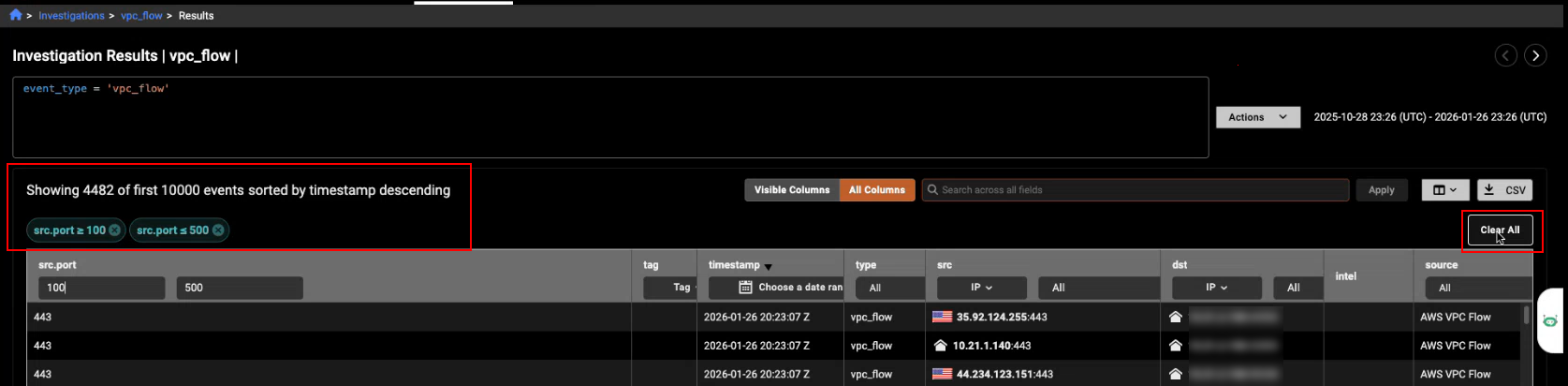 This enhancement improves the analyst experience by enabling fast, interactive filtering directly within result tables across the portal. Previously, analysts had limited options for narrowing large result sets and often needed to run additional queries (for example, filtering again by source IP, server name, or event type such as flow events). This led to repeated follow‑up queries, slowed investigations, and made it more difficult to quickly focus on relevant data.