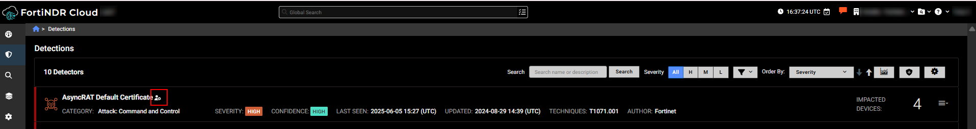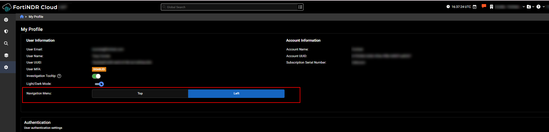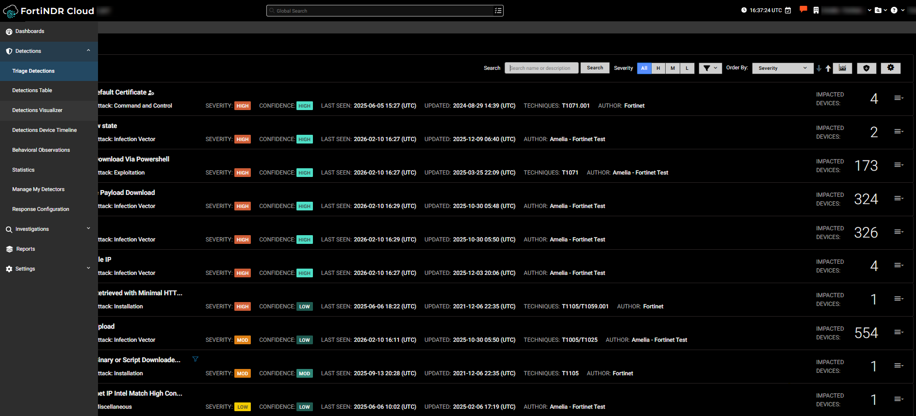 The new left navigation menu is designed to improve access to an expanding set of menu options as FortiNDR Cloud continues to grow. Many Fortinet Fabric products already use a left‑side navigation layout, and this enhancement aligns the experience while providing analysts with a more streamlined way to navigate the portal. Although the left navigation is optional in this release, it is planned to become the default navigation layout in a future release. |