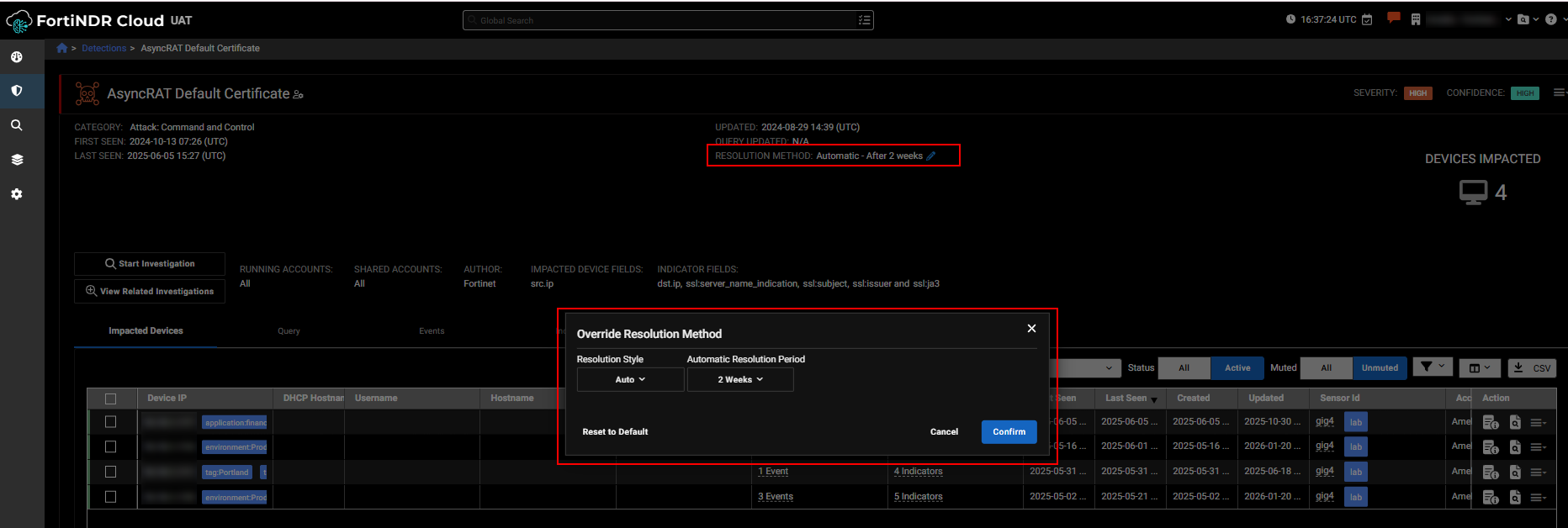 To override the resolution method, go to Detections > Triage detections and open a detector created by another account. Click the pencil icon to change the resolution method.
