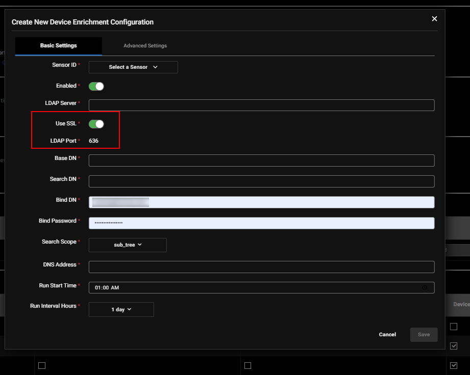 The LDAP port field in the Device Enrichment configuration has been updated to ensure consistent and secure configuration. Previously, the LDAP port was a free‑form field, allowing users to enter any value. With this enhancement, the LDAP port is now automatically determined based on the SSL setting: