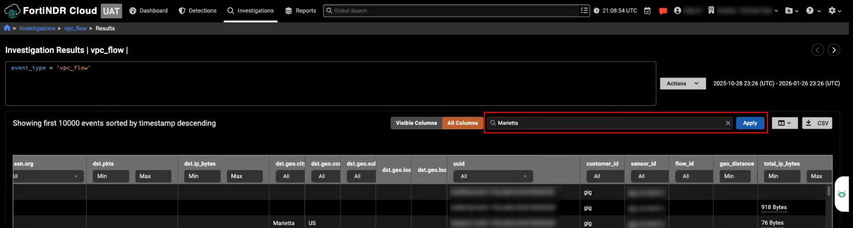 We have added a keyword filter to the following tables: Detection details (Events tab), Investigation query results, and Private search results. You can filter by All columns (including hidden columns) or Visible columns (only those currently displayed).
