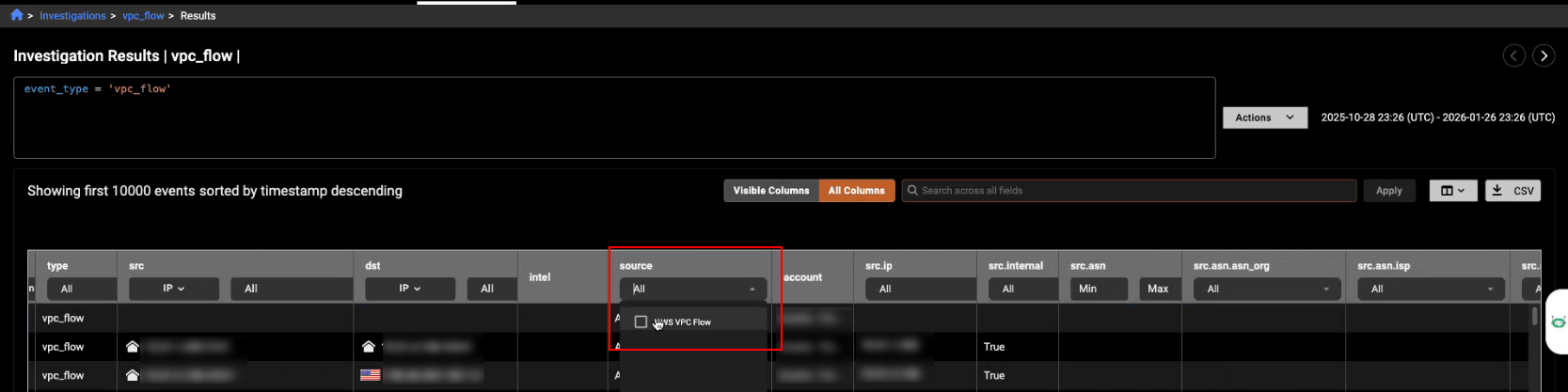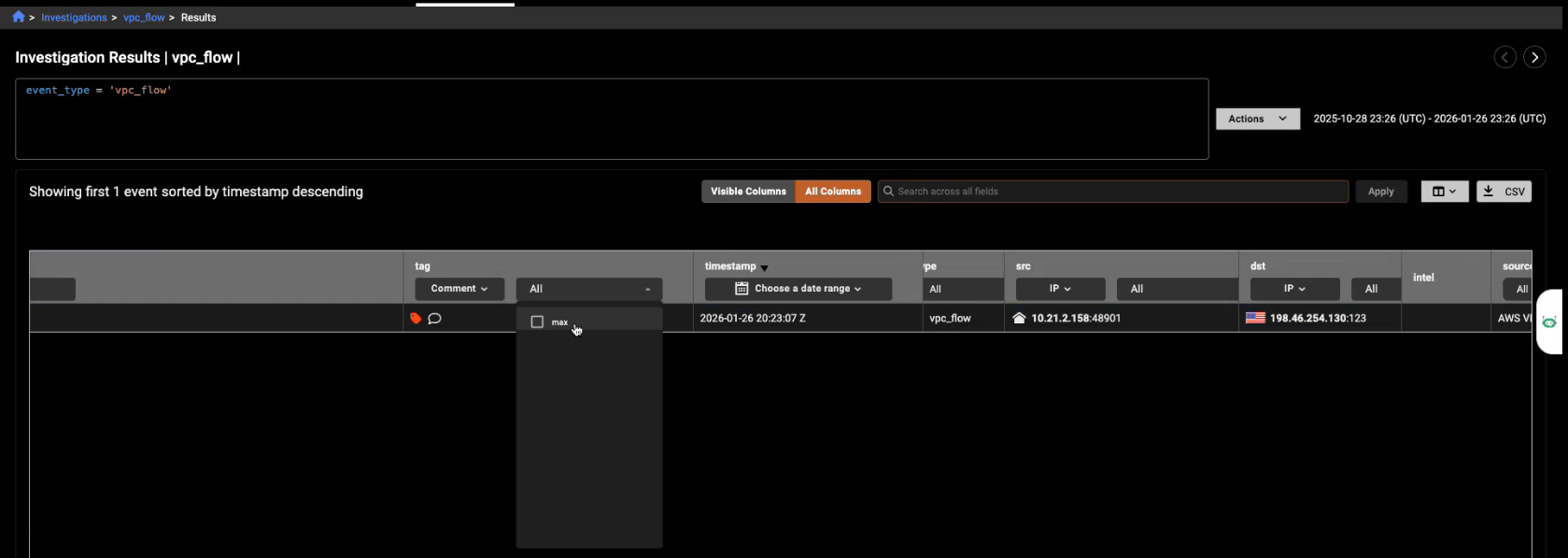 A VPC Flow fields event occurs when raw VPC Flow Log data is parsed and its individual fields are extracted and normalized into a structured event. These events are only visible when the VPC feature is enabled. To enable it, contact your TSM or Customer Support.