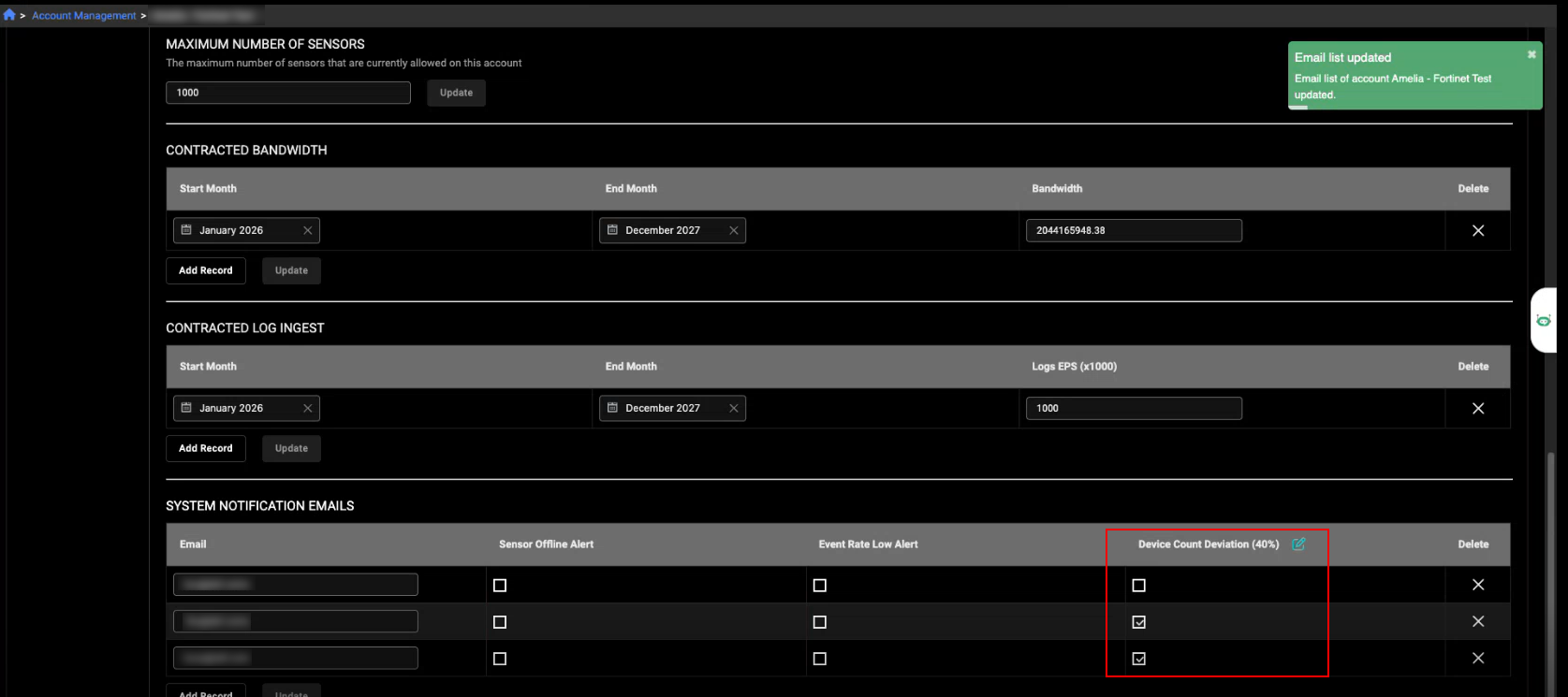 The system continuously monitors visibility for each sensor. These counts are already displayed in the Device View page. Instead of a fixed system‑wide baseline, the deviation is now calculated using a floating 7‑day window. When the visible device count for a sensor falls below that threshold, the system automatically sends a Device Count Deviation alert to the configured recipients.