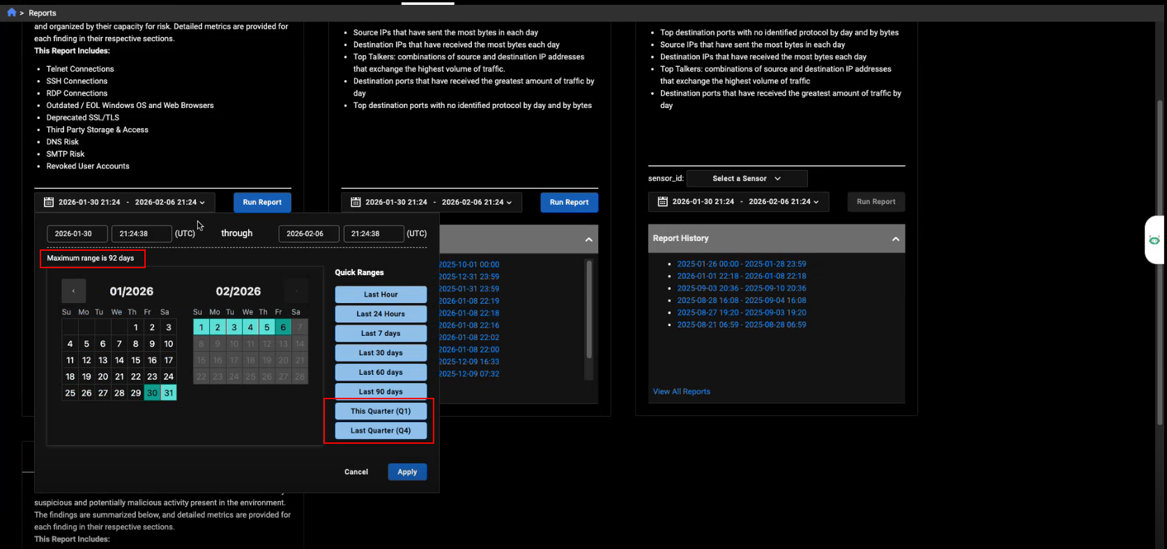 The time-range filter in Reports now supports date ranges up to 92 days instead of the previous 90, allowing you to select full calendar quarters (including quarters with 31‑day months). It also introduces quick‑select buttons for This Quarter and Last Quarter, which automatically adjust based on the current quarter.