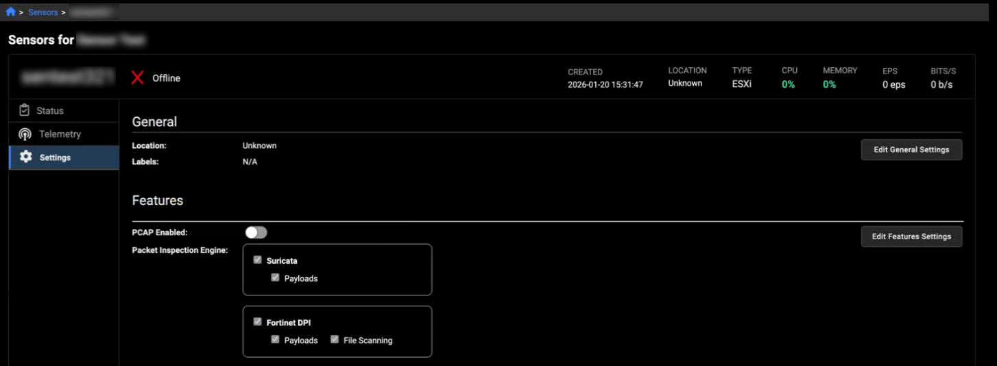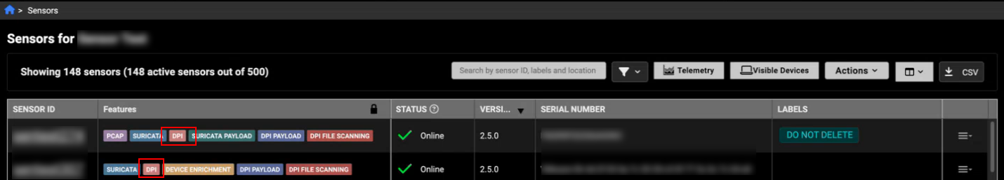 DPI payload capability is now available for sensors running version 2.5.0 or later. This ASCII representation helps determine whether traffic is malicious or benign. In the Sensor Details page, the Packet Inspection Engine settings now include additional options for DPI Payloads and DPI File Scanning.