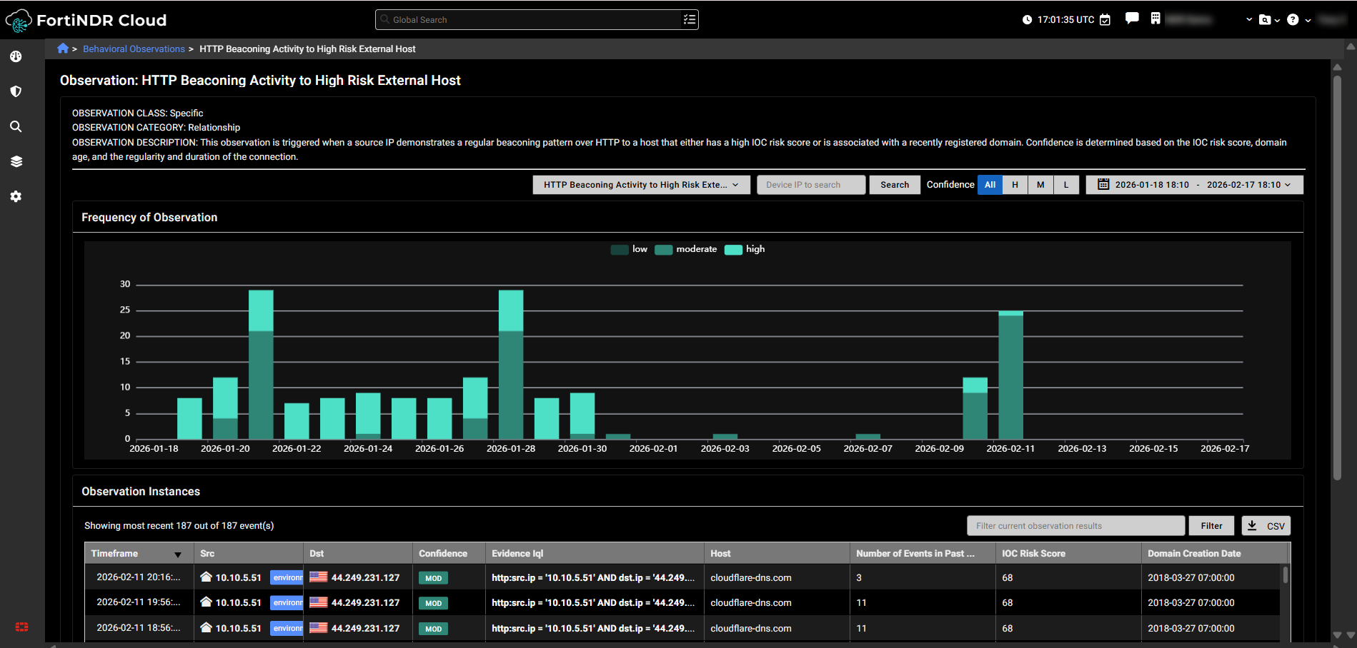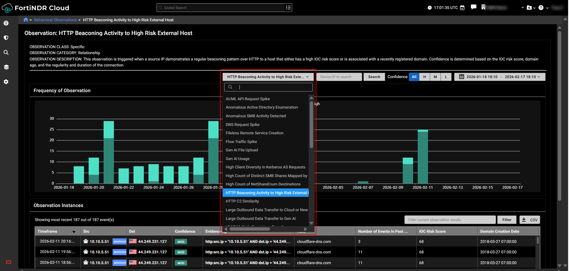 The Observation Details page provides an in‑depth view of a specific network behavior detected by FortiNDR Cloud. It summarizes the observation type, explains why it was triggered, and presents a timeline showing how often the behavior has occurred. The page also includes a table listing up to 1,000 recent observation instances with key attributes such as source, destination, confidence level, and risk score to help you investigate patterns and assess severity.