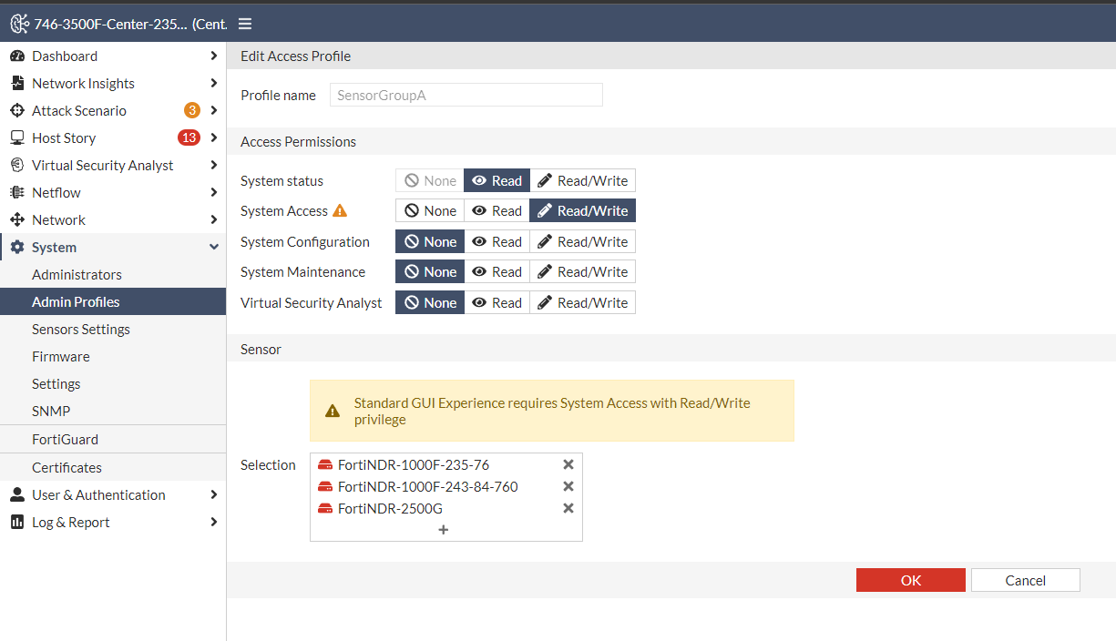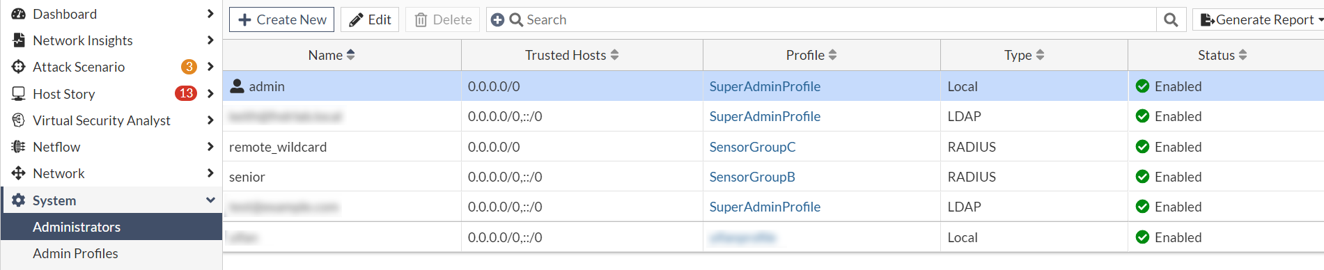 You can use Admin Profiles to assign sensors and permissions to specific administrators. When an LDAP/RADIUS administrator logs into FortiNDR, the system will use the LDAP/RADIUS profile assigned to the remote_wildcard administrator to authenticate the user.