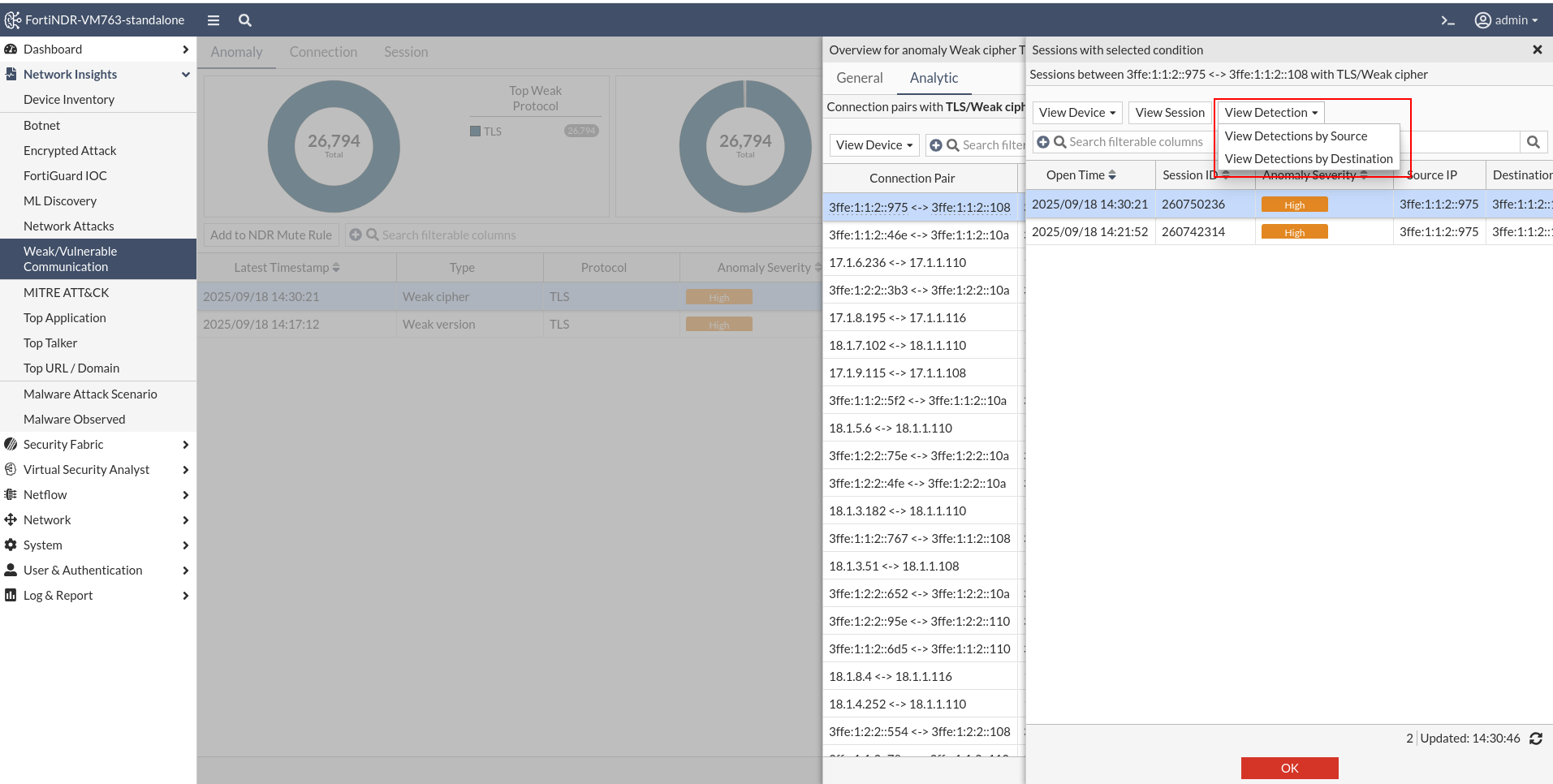 You can access the Detection Context by selecting a session in the Session tab, clicking View Detection, and then selecting either View Detections by Source or View Detections by Destination.