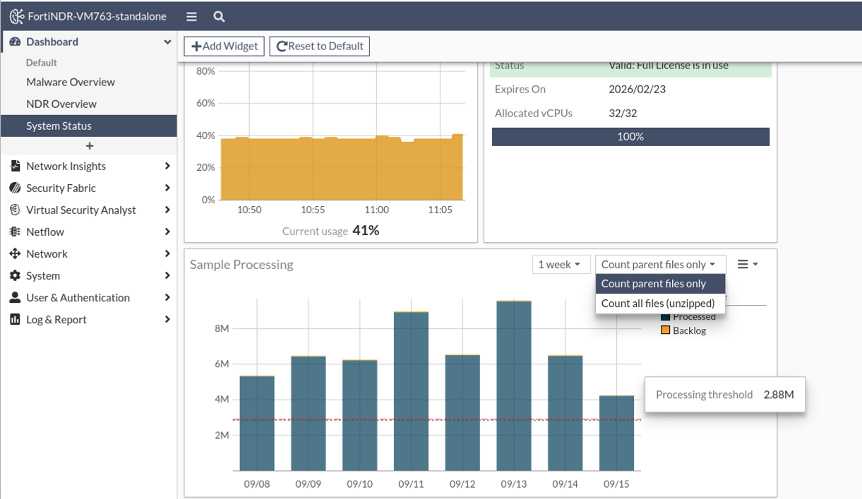 The Sample Processing widget has been enhanced with a new Processing threshold indicator. This red dotted line represents the maximum recommended processing rate for the specific appliance or VM model in use, based on the system’s expected capacity as defined in the product datasheet. The performance threshold indicator will only appear when the number of accepted files approaches the threshold. The line remains hidden when file volume is significantly lower.