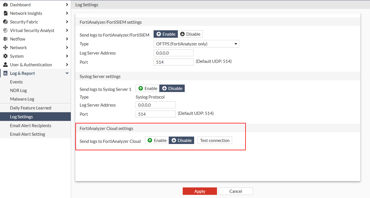 The Log Settings can now be configured to send logs to FortiAnalyzer Cloud.