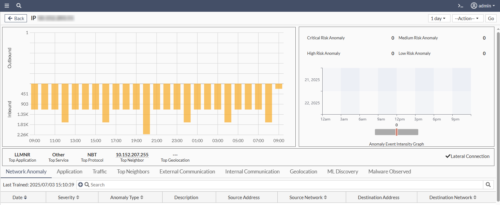 A new Time of Week option was added to the ML Configuration page to view anomalies based on the time of the week. During Machine Learning training, the system establishes a baseline of activity for each source IP. If traffic is observed during a time period where the baseline is zero (meaning no activity is expected) it is flagged as an anomaly. These anomalies are displayed in the Time of Week widget on the Anomaly Information page.