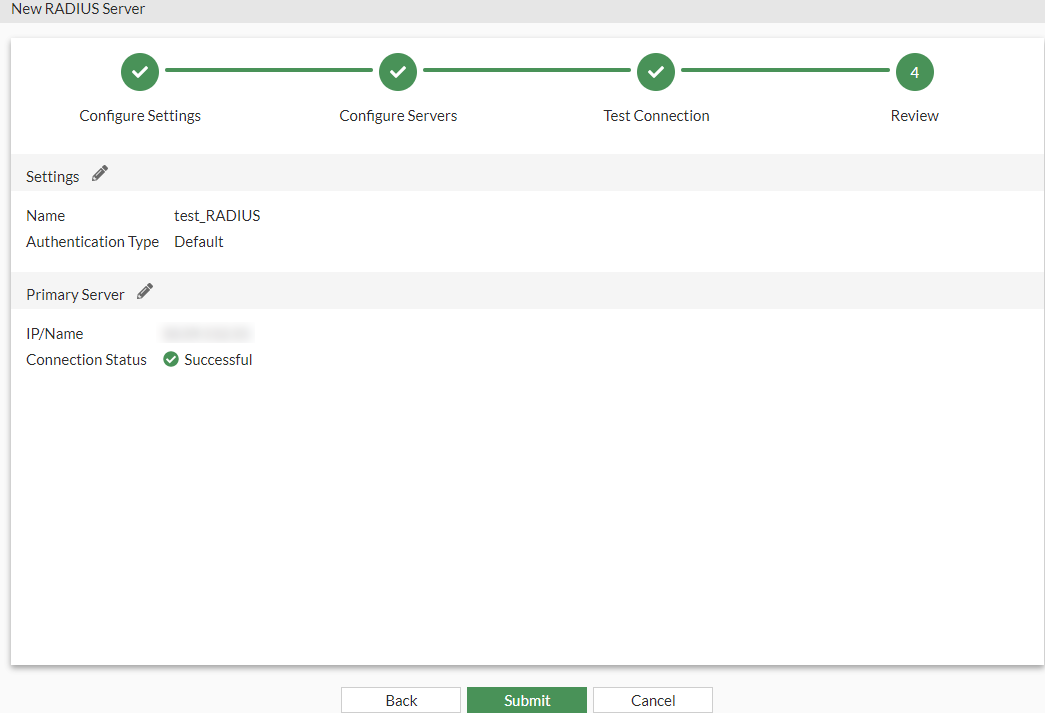 - In the Review tab, verify the information you entered and click Submit to create the RADIUS server.