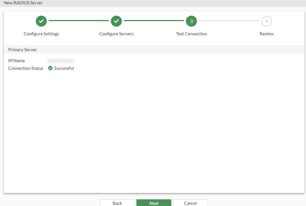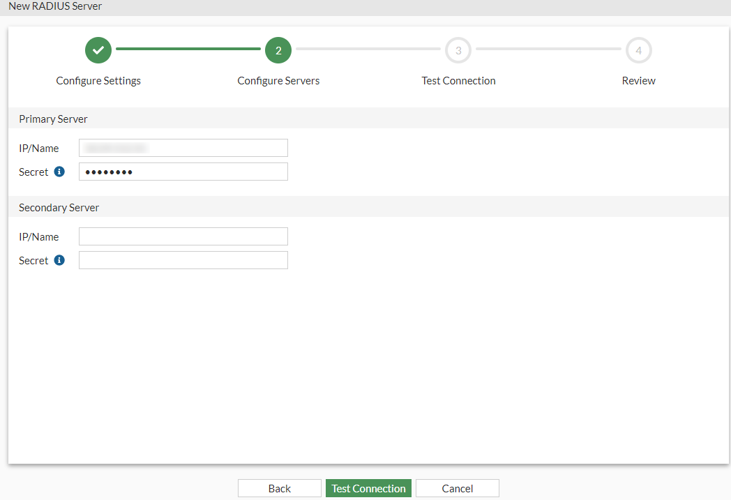 - Click Test Connection to test the connection to the RADIUS server.