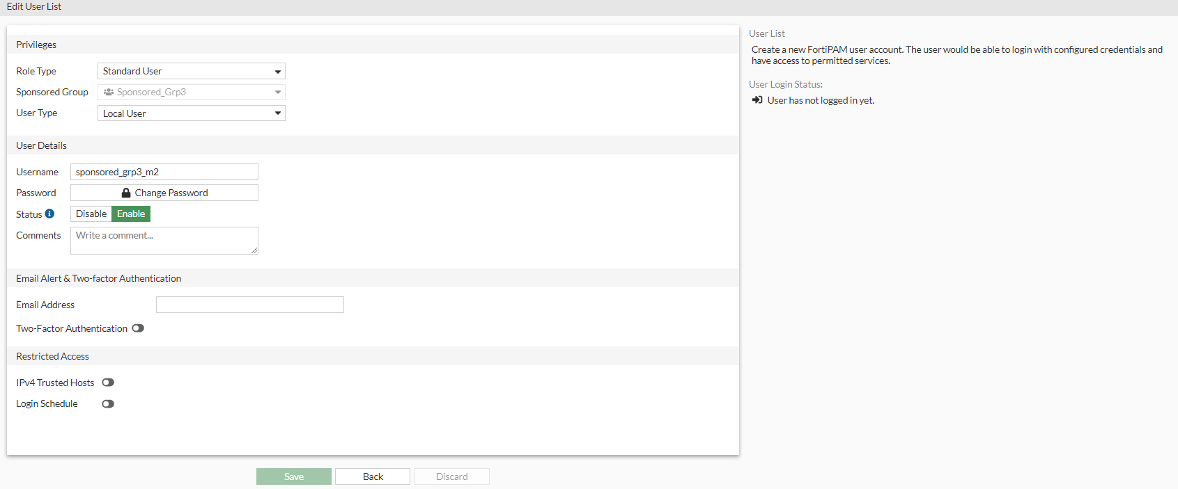 The user is automatically assigned to the sponsored group created in Creating a sponsored group.
