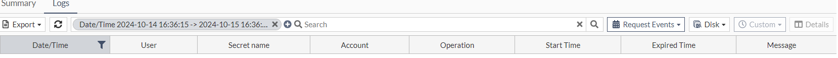 Selecting Request Events shows logs related to secret requests. This category of the secret log shows all the information related to a secret that requires secret approval. It indicates when a request is submitted for a secret or when a request is approved or denied.