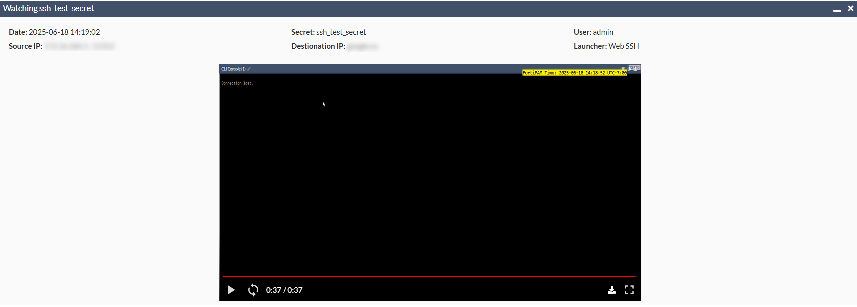 FortiPAM supports SSH log association with the secret session video playback.