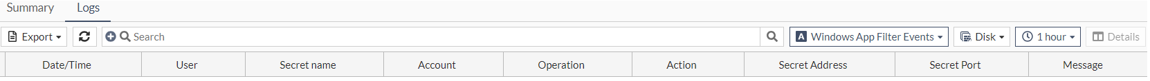 Selecting Windows App Filter Events shows all the logs related to the secret configured with Windows application filter profile. This category of the secret log shows information related to the Windows application filter activities.