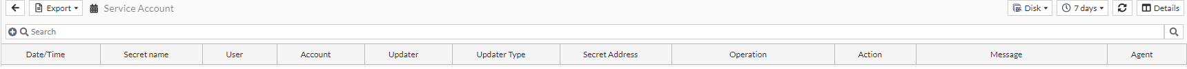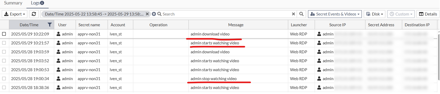 CSV: Export the selected secret session log to your computer as a CSV file named as secret-xyz-YYYY_MM_DD.csv