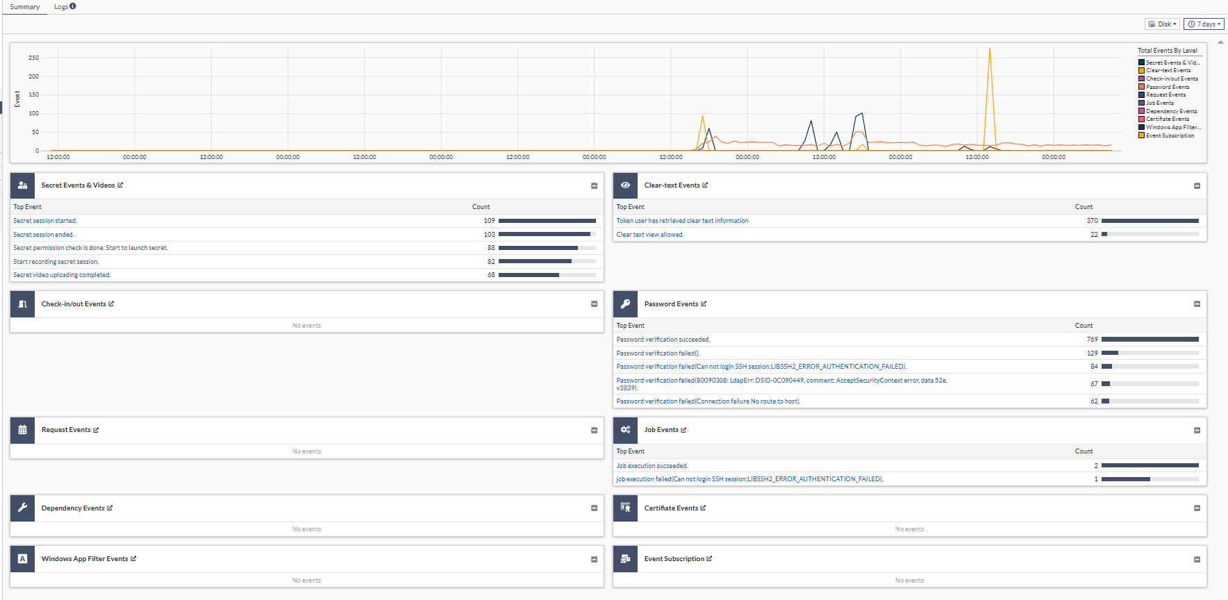Selecting Password Events shows logs related to password changers. It displays all the information about when a password changer is triggered on a secret. It indicates whether the operation is successful and who initiated the operation. Operations such as password verification or change of password are recorded here.