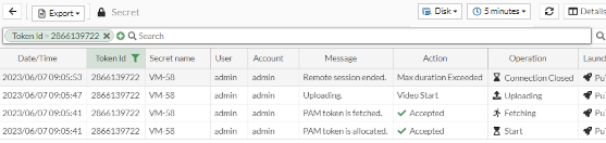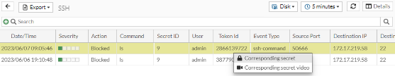 Selecting the Corresponding secret or the Corresponding secret video buttons when you right-click an SSH log takes you to the corresponding secret log or the secret video log, respectively.