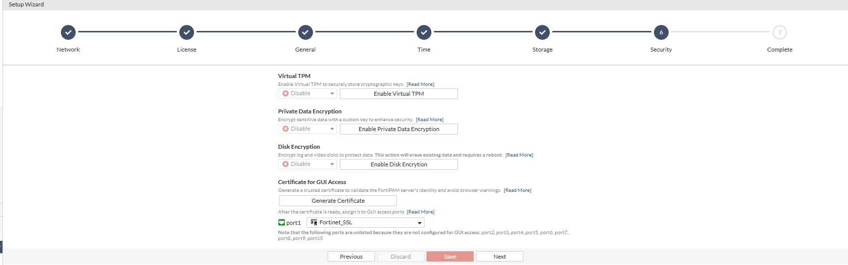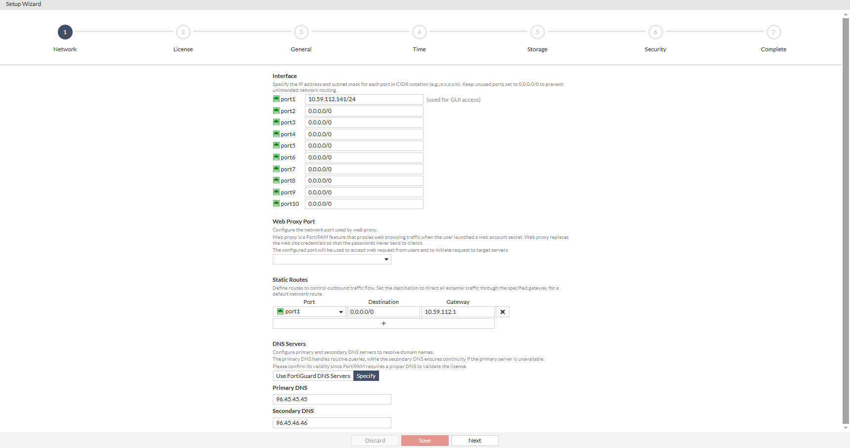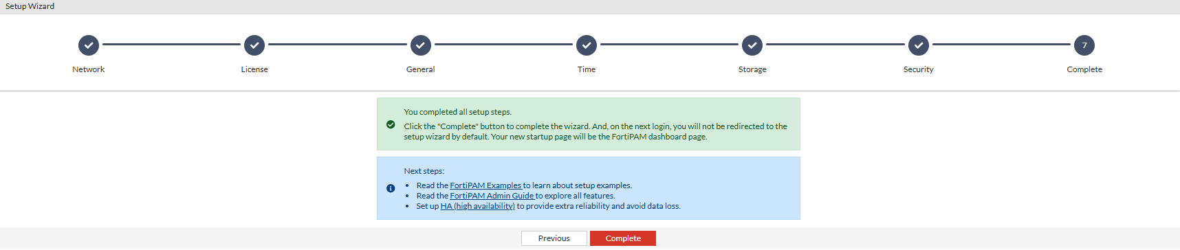 The FortiPAM setup wizard gathers all essential settings to setup a FortiPAM from scratch and provide useful information to the new users.