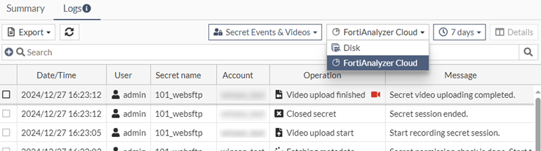 - From the Log location dropdown, select FortiAnalyzer Cloud to see the logs available on FortiAnalyzer Cloud.
