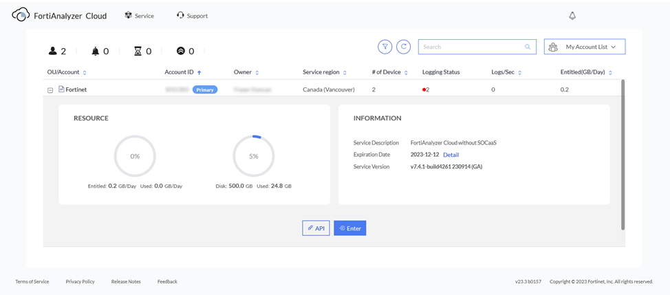 - Once provisioned, expand the account, and click Enter to access the FortiAnalyzer Cloud instance.
