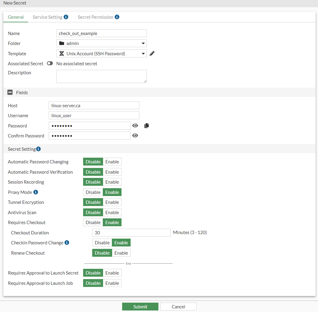 - If needed, you can enable Renew Checkout and enter the maximum number of renewals allowed in Max Renew Count. This gives you additional exclusive access to the secret. In this example, the Renew Checkout option is disabled.