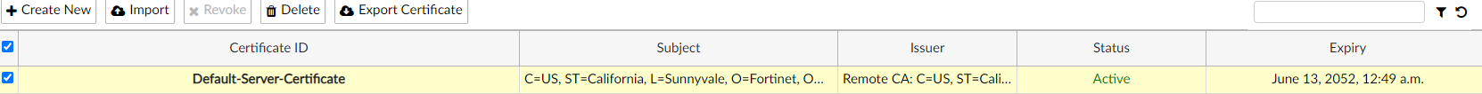 - Select the Default-Server-Certificate and then select Export Certificate to download the default certificate to your management computer.
