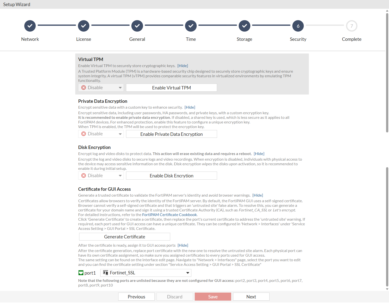 The FortiPAM setup wizard gathers all essential settings to setup a FortiPAM from scratch and provide useful information to the new users.