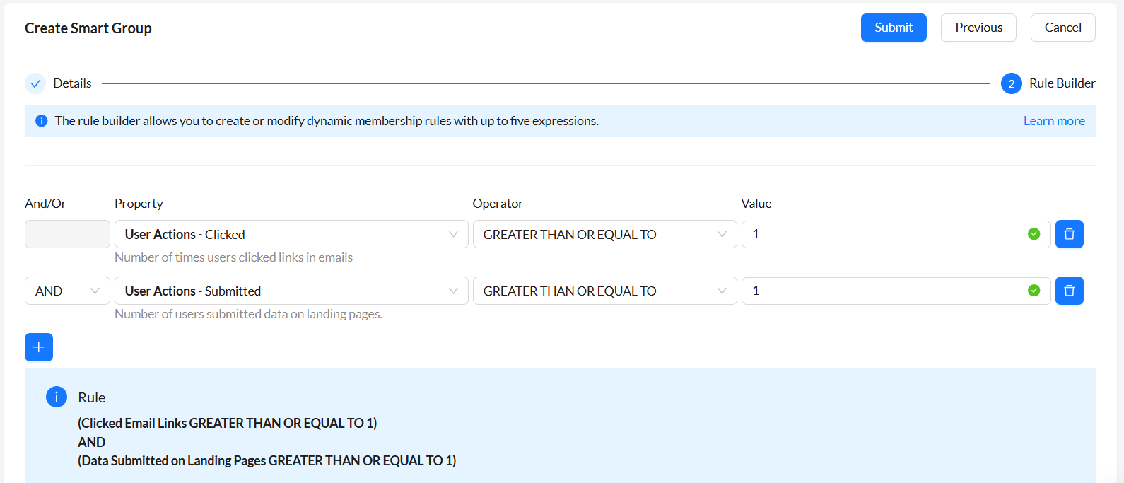 Smart Group allows you to dynamically add users to groups based on predefined rules. These rules can be defined using user properties such as risk grade, actions, campaign interactions, and training history. Once created, Smart Groups can be used to target specific user segments with tailored phishing campaigns.