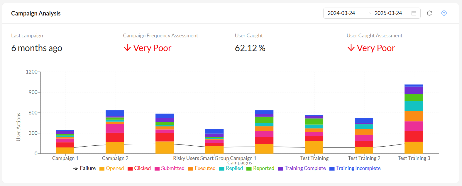 Displays the campaign statistics over time including, the duration since the last campaign, the campaign frequency assessment, the number and the percentage of users caught. To launch a new campaign, click the Create a Campaign link. See Creating campaigns .