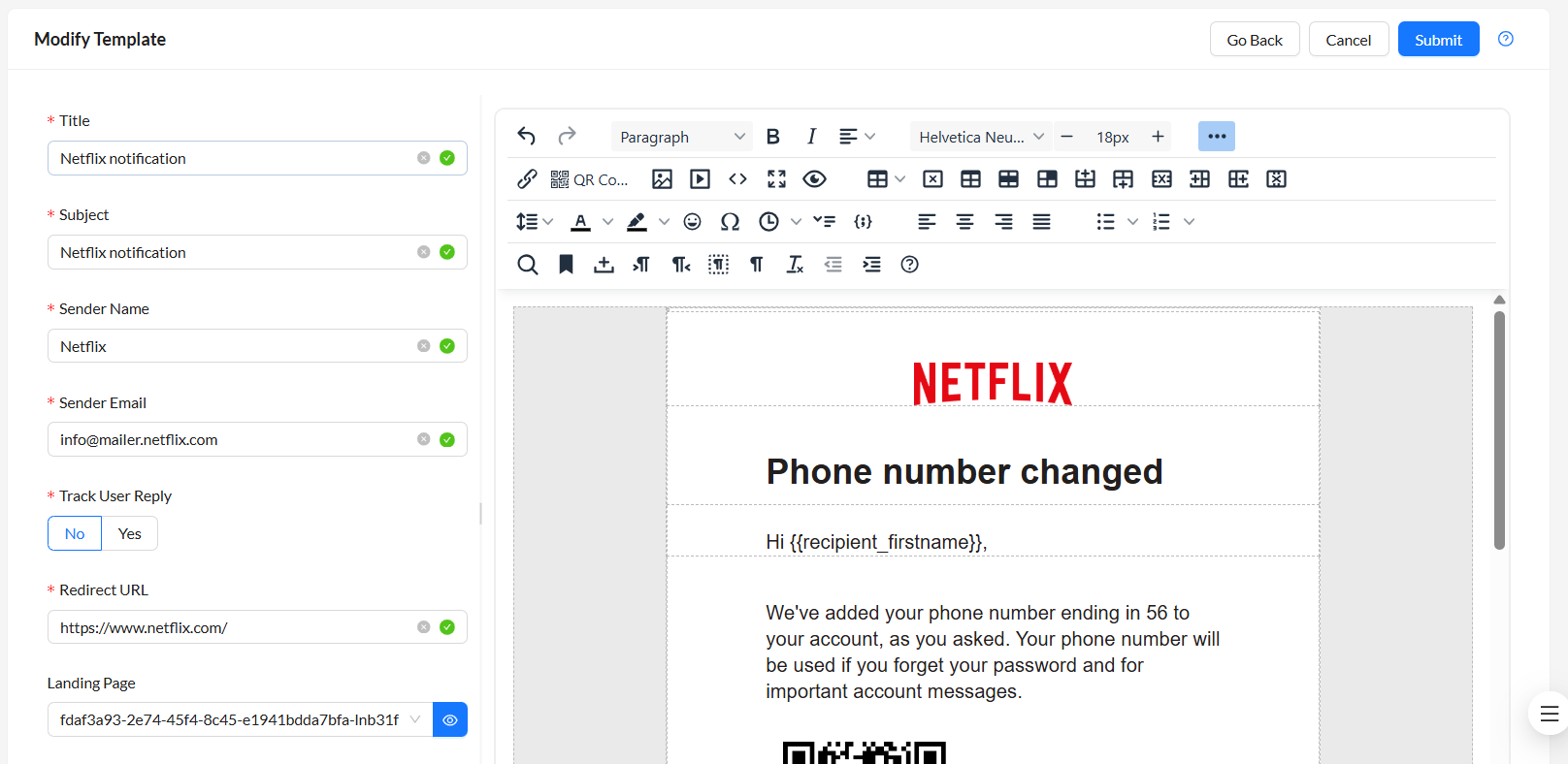 - In the text editor, compose the email body. You can insert links, images, QR code, and media.