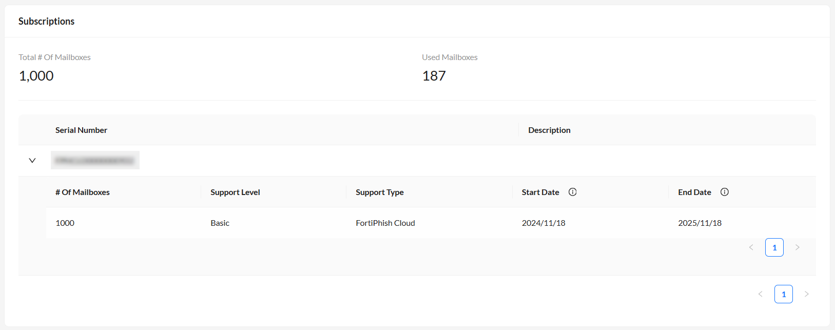 The Subscription page displays your current FortiPhish subscription details. You can view the total and used number of mailboxes, as well as license information, including the serial number.