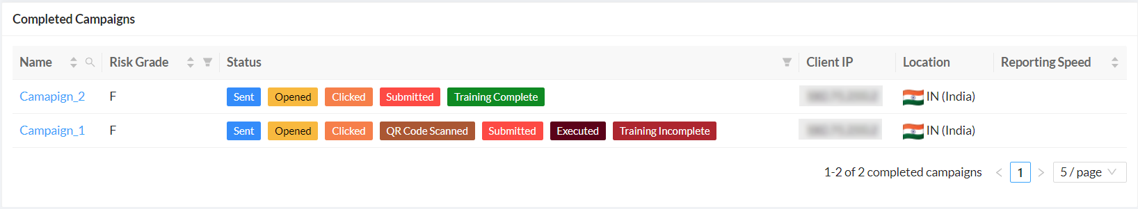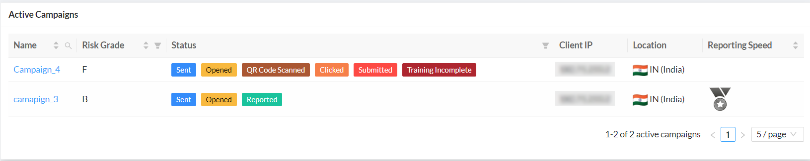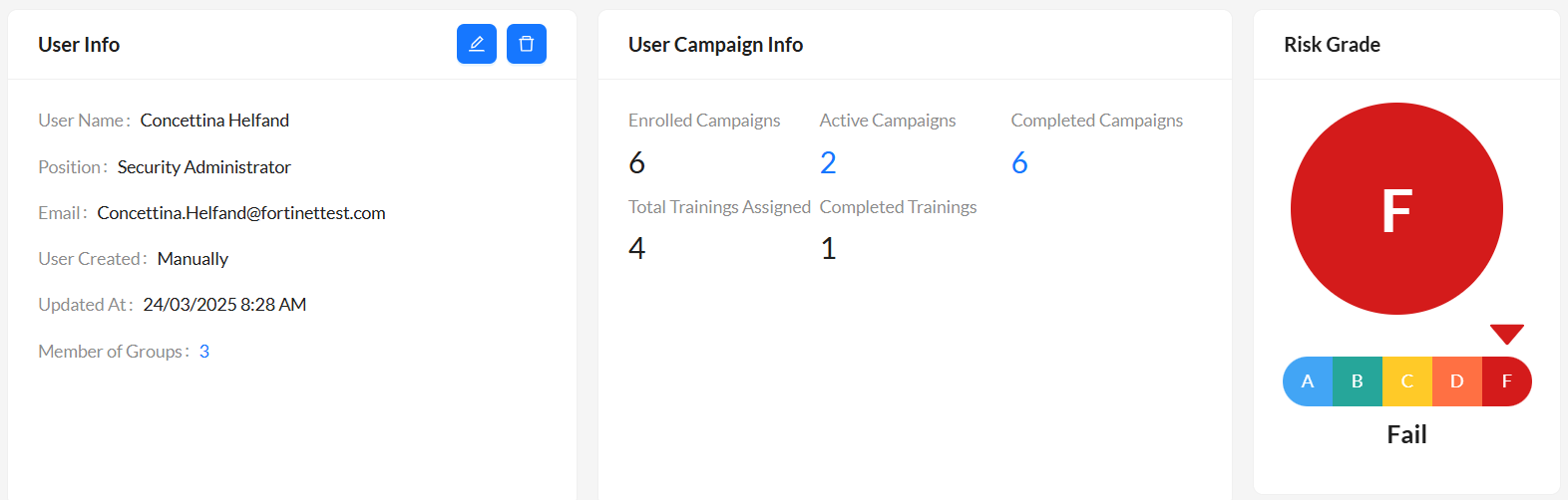 Provides a graphical representation of the user's risk score across campaigns. Hover over the graph to view the risk grade.