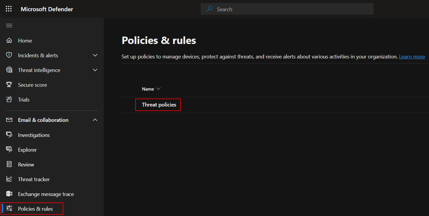 In the navigation menu, select Email & collaboartion > Policies and rules.