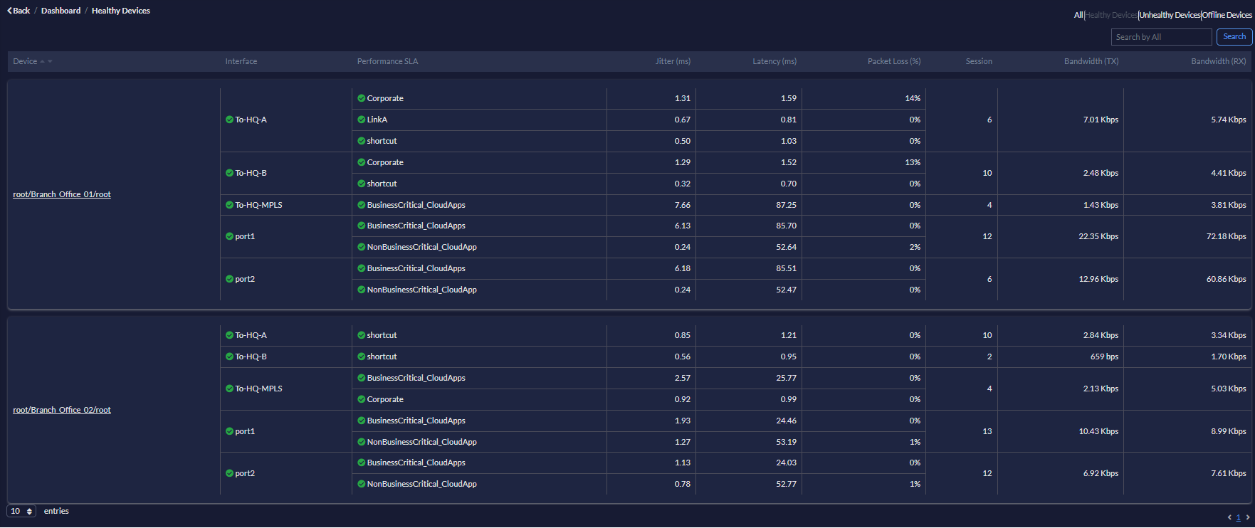 From the top-right, select All/Healthy Devices/Unhealthy Devices/Offline Devices to display related information in the table. |