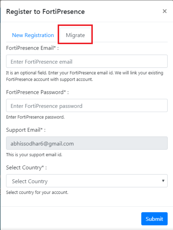 Your FortiPresence account is migrated to the https://support.fortinet.com registered email ID. |