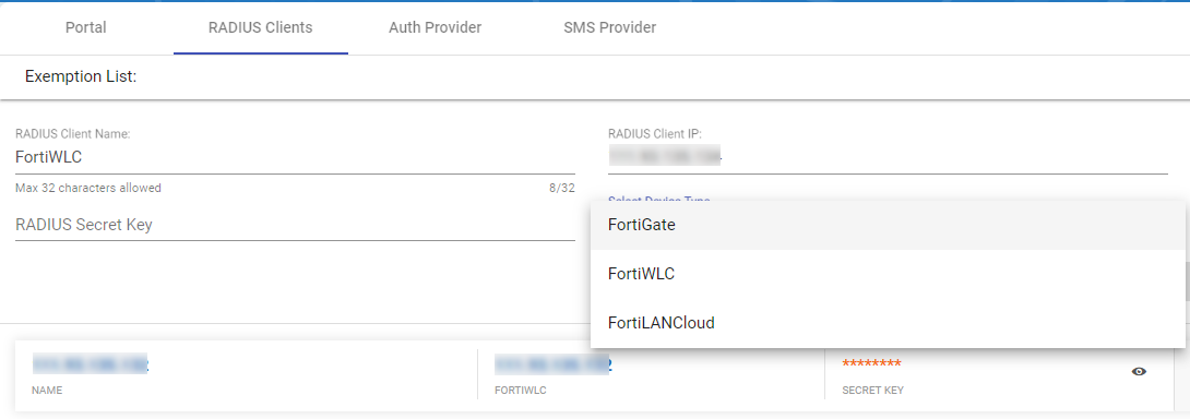 The Project Secret Key is fortipresence. - Navigate to Portal Management and select the site to attach the configured RADIUS client.
